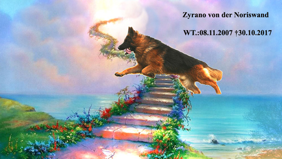 Zyrano von der Noriswand 08.11.2007 - † 30.10.2017 Man hat gemerkt, daß du immer anhänglicher und ruhiger geworden bist. Dabei war "ruhig" sonst ein völliges Fremdwort für dich. Ich wusste, daß mit dir irgendetwas nicht stimmt, auch wenn alle gesagt haben, du seist wie immer. Ich sollte leider Recht behalten... In der letzten Nacht ging es dir dann von Minute zu Minute schlechter, bis wir entschieden haben, daß wir dir diesen Leidensweg ersparen werden. Der Tierarzt ist mitten in der Nacht gekommen und hat dich von deinen Schmerzen erlöst. Du warst immer unser Zappelkopp und wir haben die ganzen Jahre richtig viel Freude an dir und deinen zahlreichen Nachkommen gehabt. Du hast niemals Streit mit anderen Hunden angefangen und warst immer jedermanns Freund gewesen. Selbst Menschen, die Angst vor Hunden hatten, konntest du vom Gegenteil überzeugen. Ich bin froh und dankbar darüber, daß du mich ein Stück meines Lebens begleitet hast und in der dunkelsten Zeit meines Lebens immer an meiner Seite warst und mir grenzenloses Vertrauen und Kraft geschenkt hast. Du wirst in deinen Nachkommen weiterleben. Ich wünsche dir alles erdenklich Gute auf deiner Reise, mein Freund, wo auch immer sie dich hinführt!!!